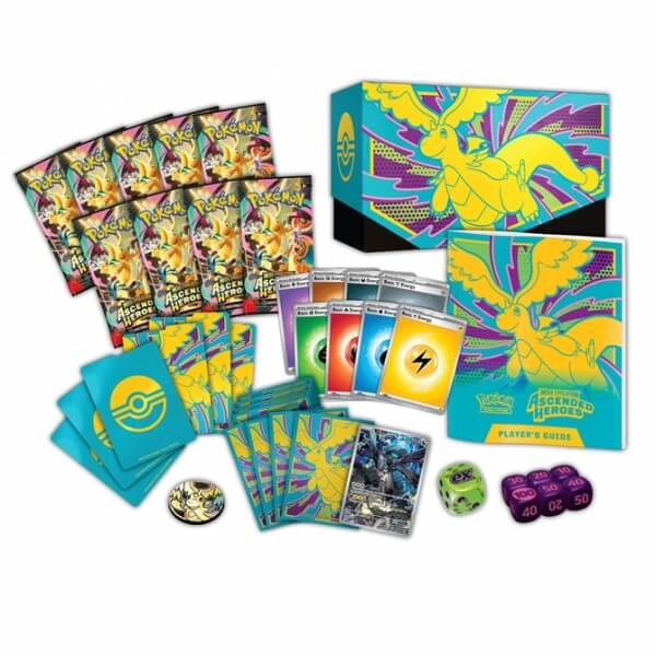 Elite Trainer Box Ascended Heroes je balenie 9 balíčkov kariet Pokémonov, 1 promo karty N’s Zekrom, 65 obalov, 6 kociek a oddeľovačov. Každý balíček obsahuje 10 kariet. Celkovo tak získate 90 kariet Pokémonov.