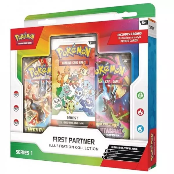 Pokémon Ascended Heroes First partners Deluxe pin collection je špeciálne darčekové balenie kariet Pokémon. Toto balenie obsahuje 5 booster balíčkov, 3x promo karty a odznak.